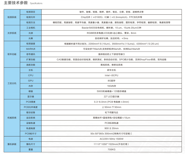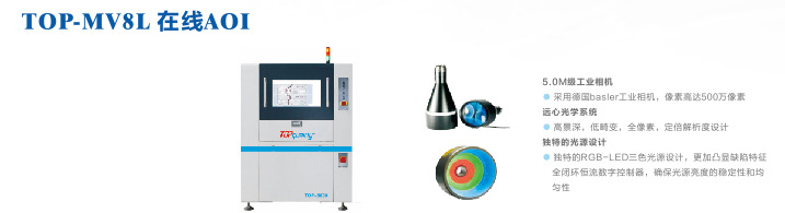 TOP-MV8L在線型AOI 采用德國Basler工業(yè)相機(jī),像素高達(dá)500萬像素。高景深,低畸變,全像素,定倍解析設(shè)計。