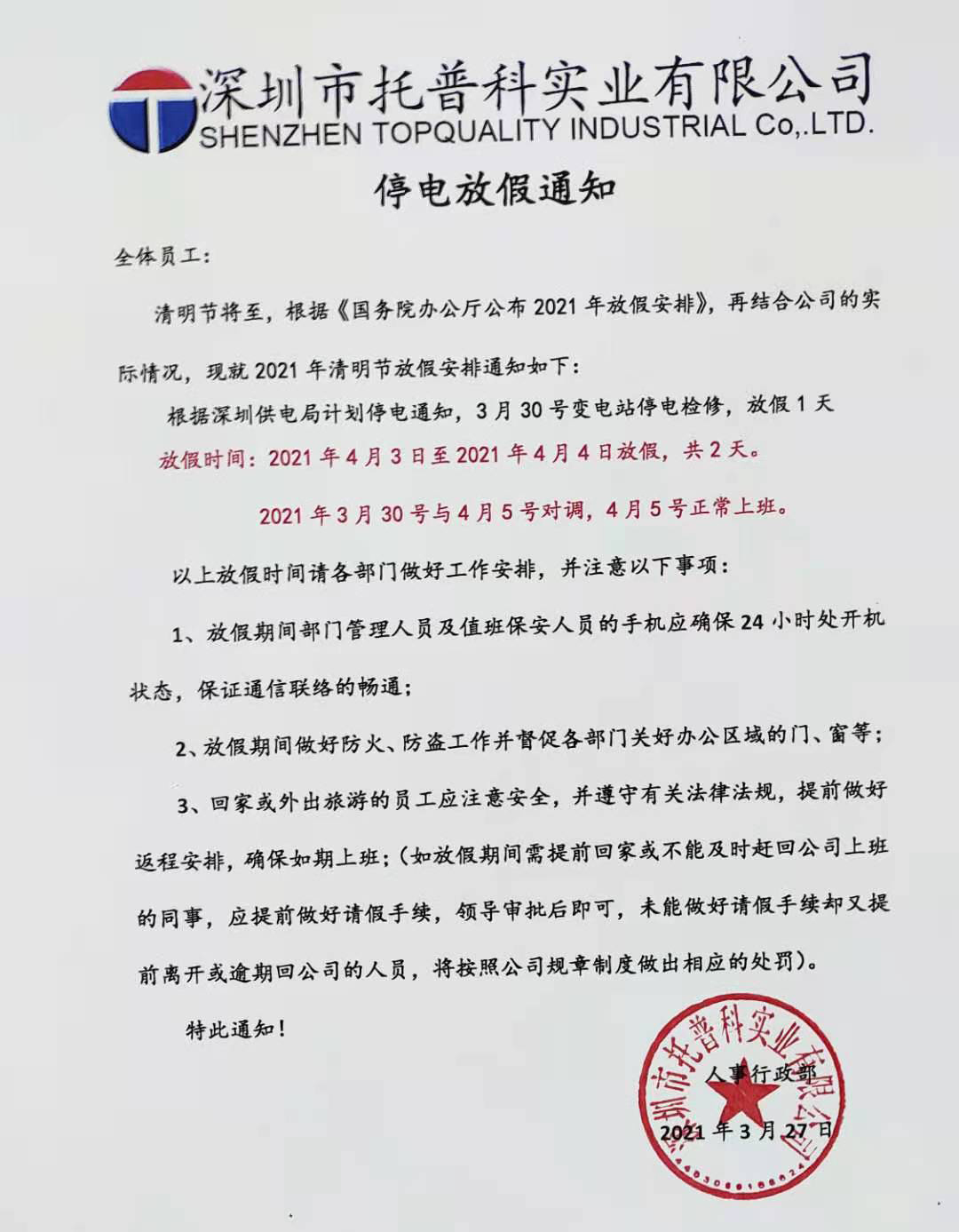 深圳市托普科實(shí)業(yè)2021年清明節(jié)放假通知