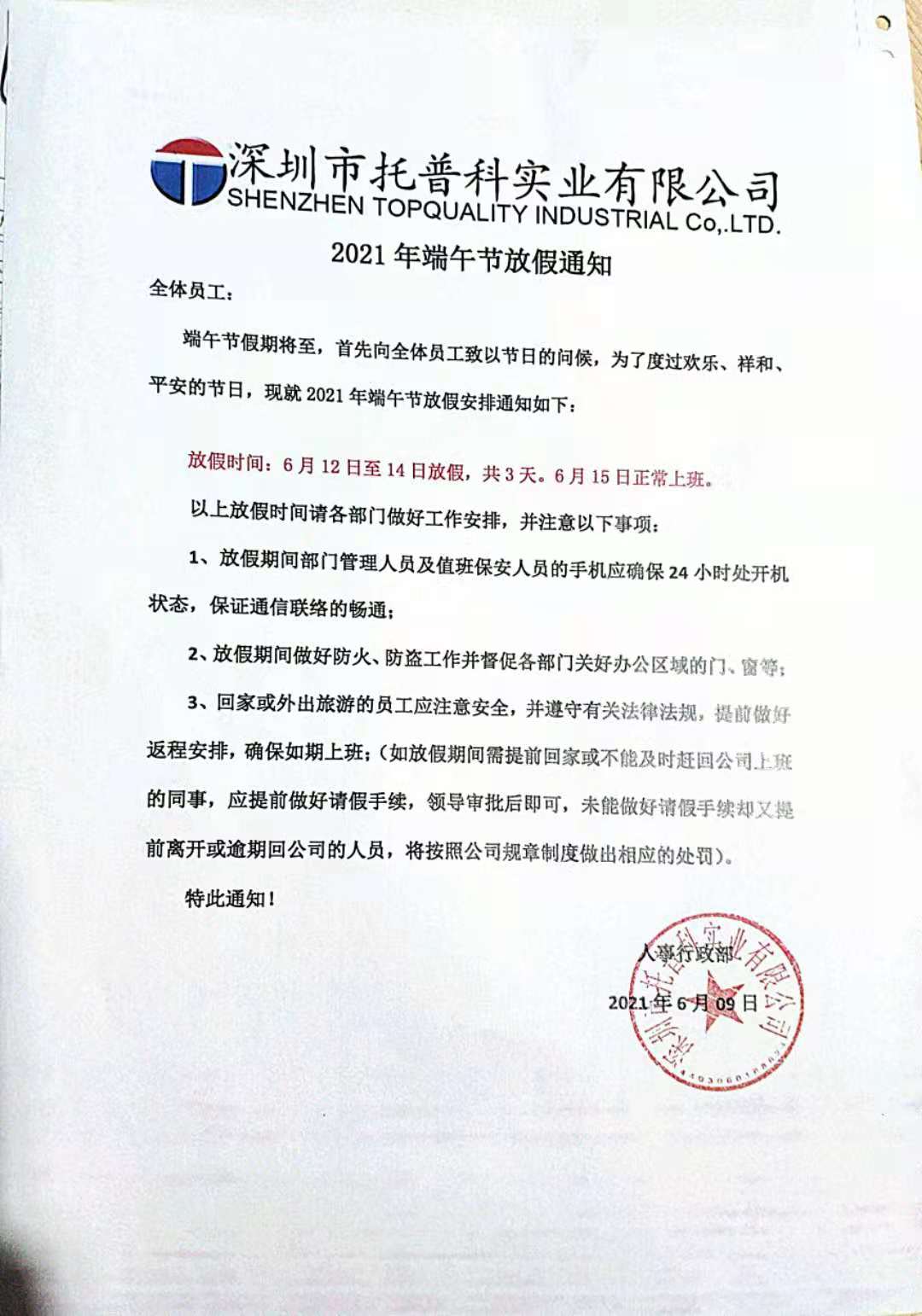 深圳托普科實業(yè)2021端午節(jié)放假通知