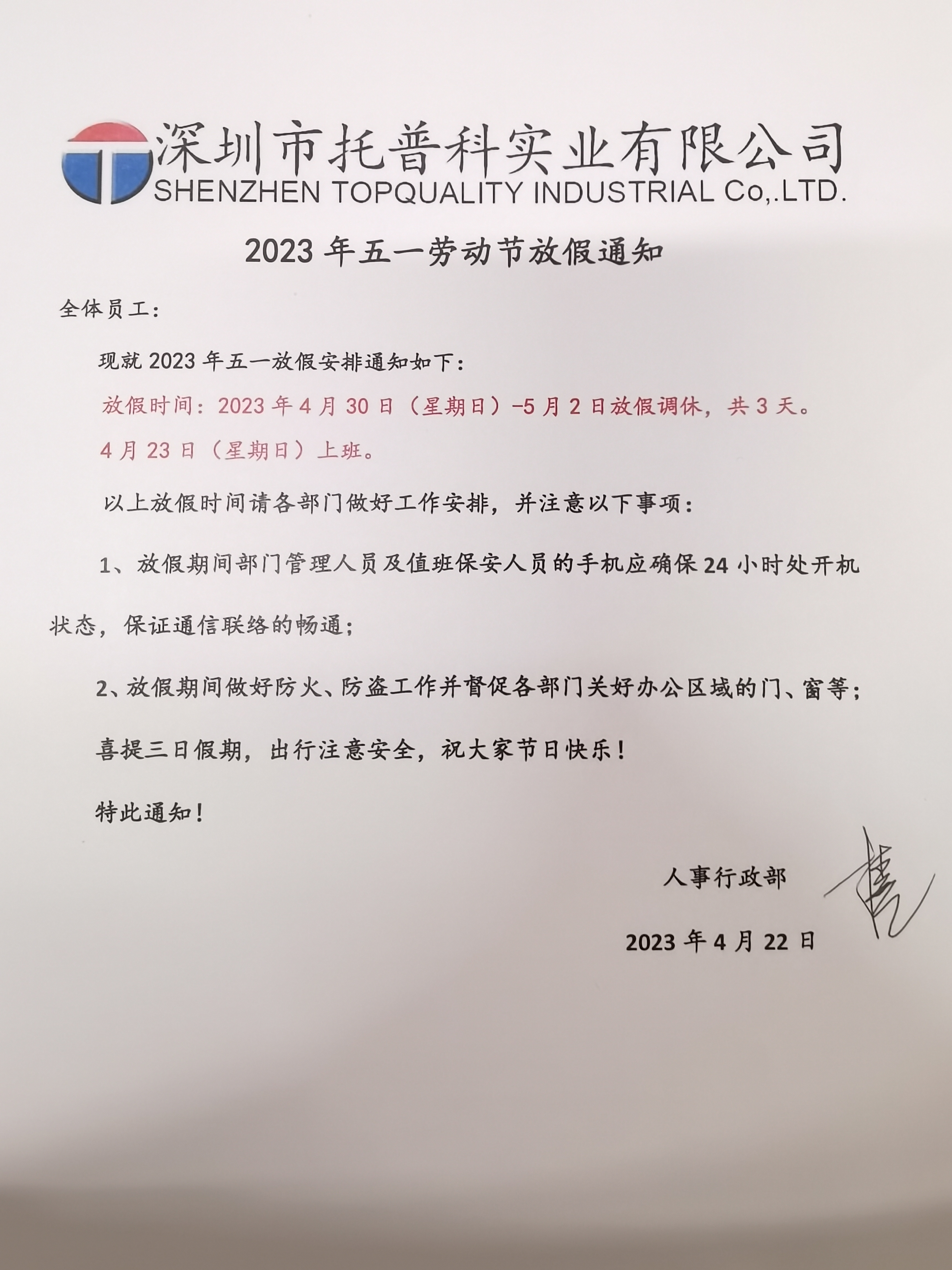 深圳托普科實業(yè)2023年五一放假通知