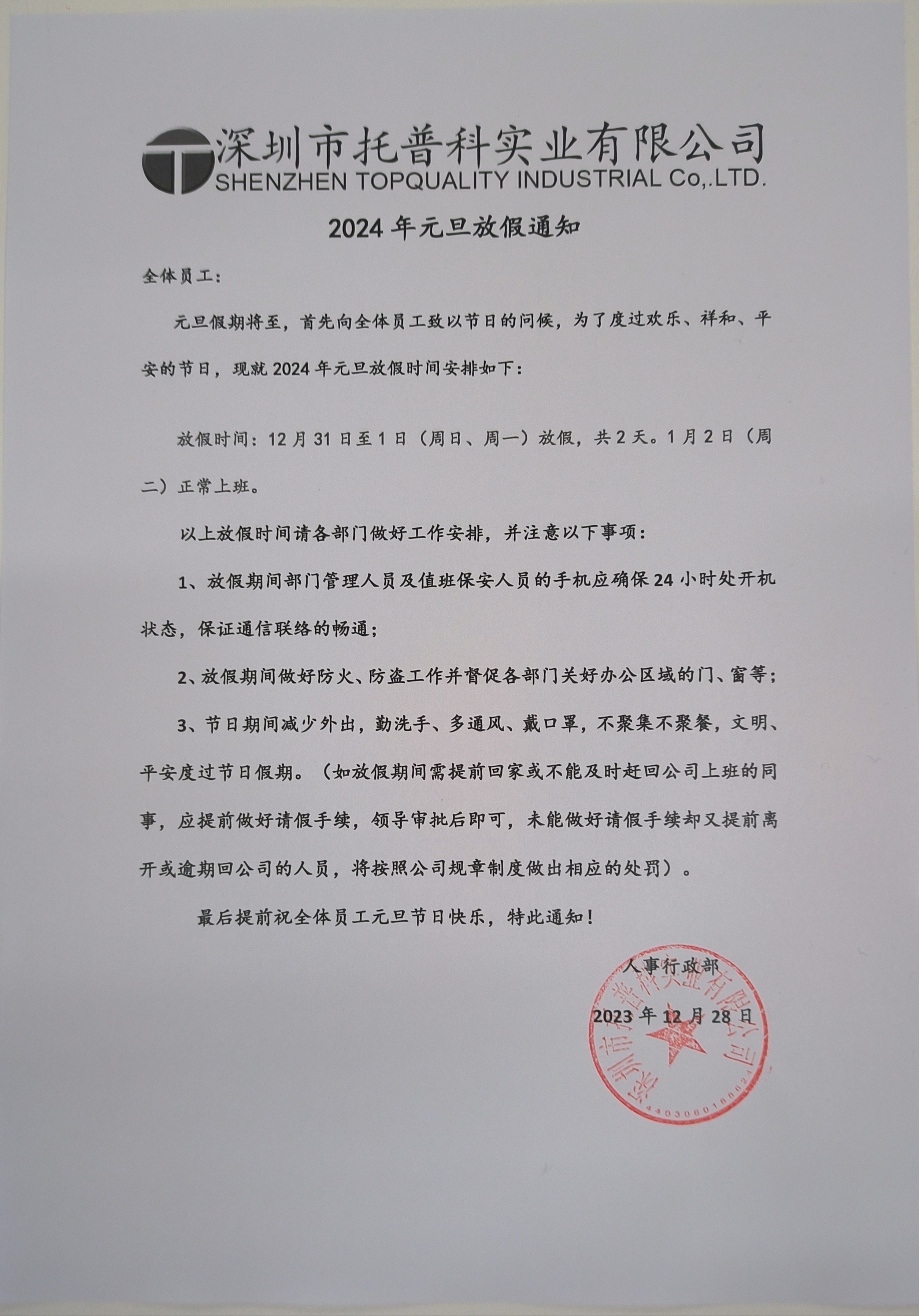 2024元旦即將來臨,根據(jù)有關(guān)規(guī)定,結(jié)合公司實際情況,現(xiàn)將2024年元旦節(jié)放假事項通知如下: