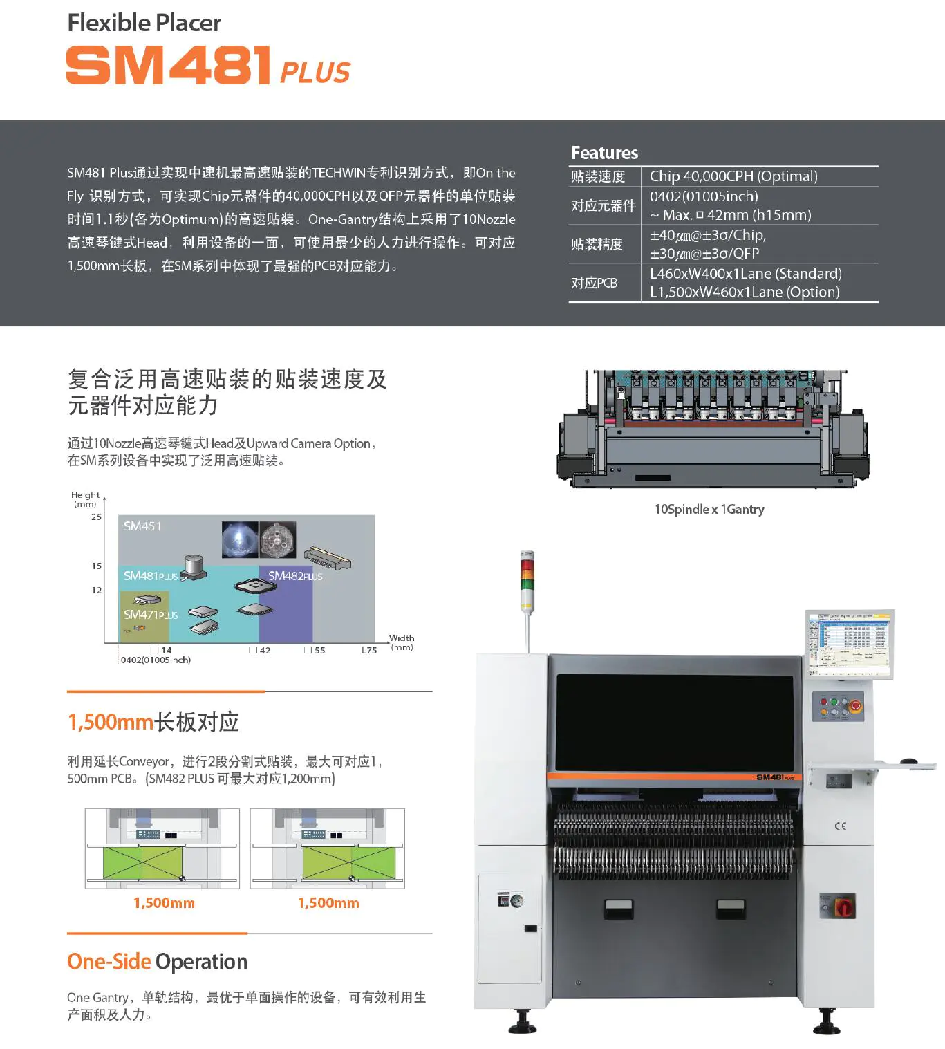 三星/韓華SM481PLUS是一臺中高速貼片機,SM481PLUS韓華貼片機主要分布2個元件識別區(qū)。 頭部飛行相機識別及固定高精度精密相機,單機可獨立完成所有產品貼裝。
